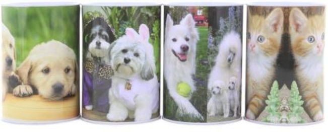 - Plechová pokladnička s motivem pejsků a kočiček o velikosti cca 12 x 8,5 cm.