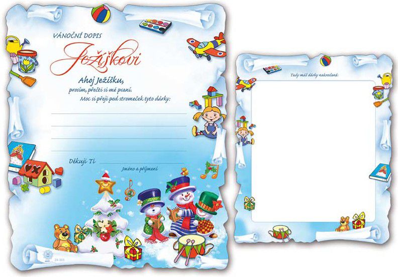 Přání Vánoční dopiš Ježíškovi. Napsat dopis Ježíškovi je již vánoční tradice. Milují ji nejen děti, ale i dospělí. Napište se svou ratolestí dopis Ježíškovi a nakreslete mu i obrázek. Ježíšek tak zjistí všechna tajná přání dětí a na nic nezapomene. Dopis můžete dát jen tak za okno nebo jej pošlete poštou přímo Ježíškovi. Text na přední straně přání: Vánoční dopis Ježíškovi Ahoj Ježíšku, Prosím, přečti si mé psaní, Moc si přeji pod stromeček tyto dárky: Děkuji Ti. Text uvnitř přání: Tady máš dárky nakreslené: Papír: pohlednicový karton 240 g Přání je baleno v sáčku, součástí balení je i dopisní obálka. Uvedená cena je za 1 ks.