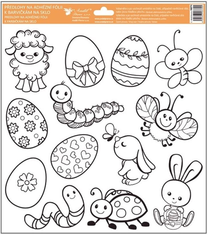 Tyto adhezní předlohy s velikonočními motivy nabízí perfektní základ pro vaši kreativitu. Předlohy s vyvýšenou černou konturou jsou připravené k vybarvení pomocí barev na sklo, barevných lepidel, glitrů a dalších technik. Ideální pro vytváření krásných dekorací na sklo, okna nebo jiné hladké povrchy.