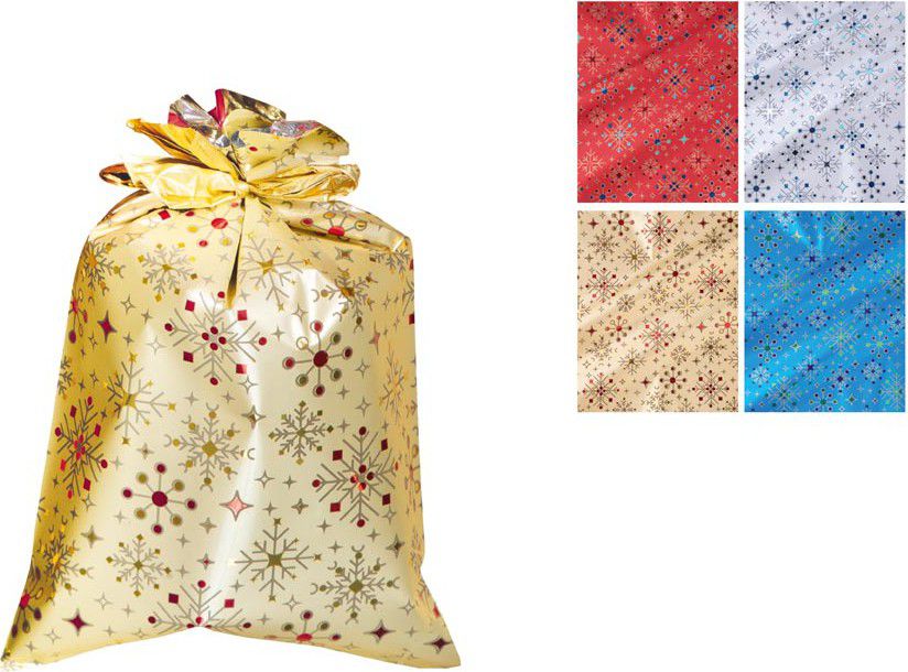 Vánoční dárkový sáček, vyrobený z lesklého materiálu s dekorativním potiskem sněhových vloček a hvězdiček. Umožňuje snadno zabalit různé druhy drobných dárků bez nutnosti použití balicího papíru. Praktický a elegantní způsob balení, který šetří čas i námahu. Sáček můžete uzavřít vázací stuhou a tím ho dozdobit. Materiál: polypropylen Rozměr: 350 x 500 mm Motiv: sněhové vločky, hvězdičky Barva: červená, stříbrná, zlatá, modrá Dodáváme v mixu po 4 ks dle skladové zásoby. Uvedená cena je za 1 ks.