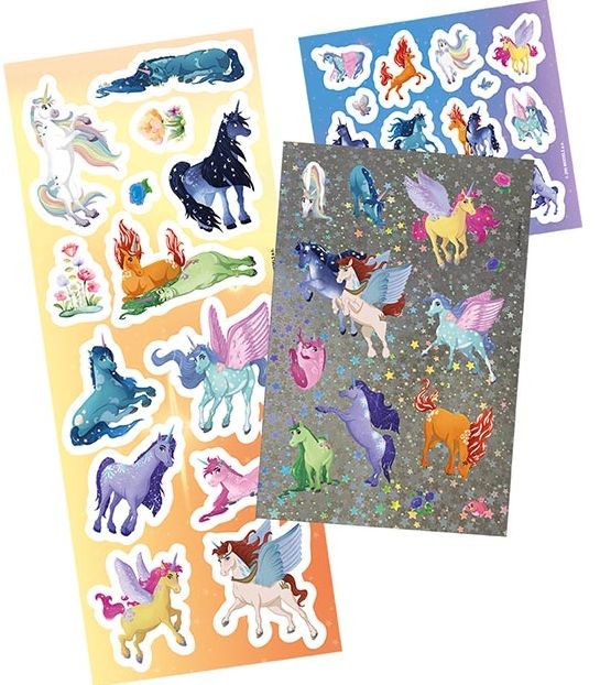 - Set obsahuje list klasických papírových samolepek, list samolepek s fóliovým efektem a list samolepek s barevnými glitry.