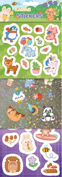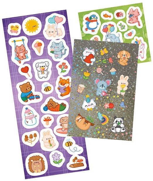 - Set obsahuje list klasických papírových samolepek, list samolepek s fóliovým efektem a list samolepek s barevnými glitry.