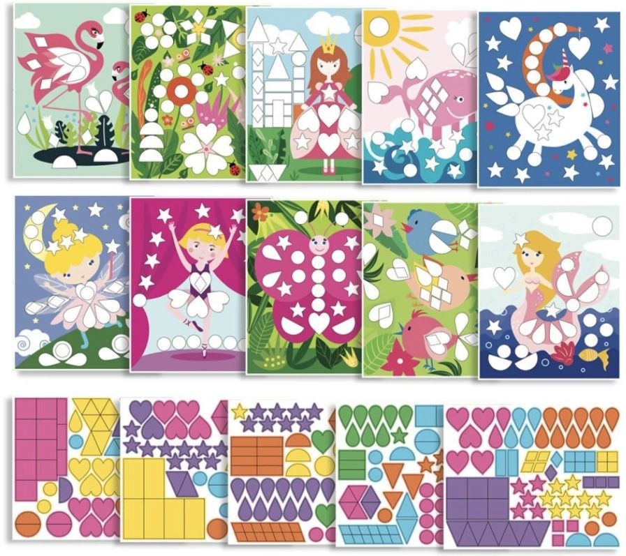 - 10 předtištěných obrázků (21 × 17 cm) k dotvoření s veselými motivy: víla, princezna, šperky, kočka, poník, jednorožec, tanečnice, květina, delfín, mořská panna