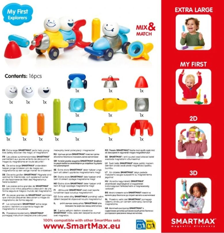 - Nechte děti kombinovat a tvořit. Tato stavebnice je kompatibilní s dalšími sadami SmartMax, což umožňuje vytvoření jedinečných a zábavných vozidel nebo letadel podle vlastní fantazie. Díky magnetickým spojům jsou možnosti skutečně neomezené! Dílky se snadno a bezpečně spojují, což zaručuje bezproblémové sestavení i pro nejmenší děti.