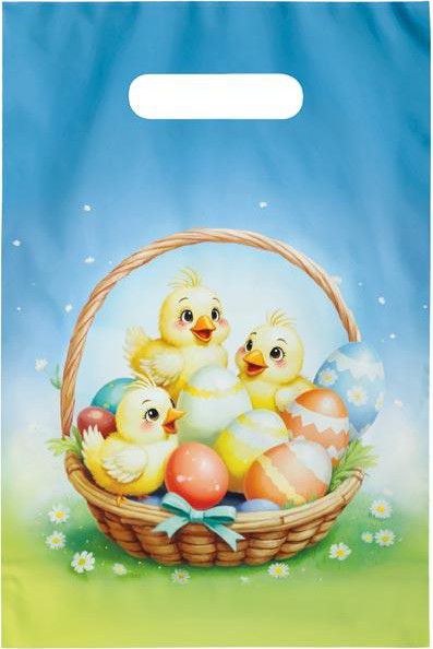 Motiv kuřátek a barevných kraslic patří neodmyslitelně k Velikonocům a je ideální na výslužku pro děti. Tato velikonoční igelitová taška MFP umožňuje sladkosti a drobnosti předat hezky a bez složitého balení. Taška má výřezový průhmat pro pohodlné nošení. Tisk: 4+0 CMYK Materiál: polyethylen