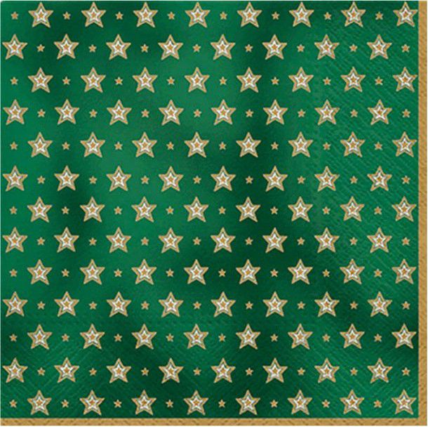 Vánoční ubrousek se zlatými hvězdami Elegantní ubrousek se zeleným podkladem a zlatými hvězdami vnese do vašeho stolování nádech luxusu a slavnostní atmosféry. Díky jednoduchému, ale výraznému motivu se skvěle kombinuje s klasickým bílým či zlatým servisem a hodí se jak k tradičním, tak i k moderním dekoracím. Ubrousek je třívrstvý a je vhodný pro vánoční tabuli i různé dekorativní aranžmá. Motiv: hvězdy Rozměr: 33 × 33 cm POČET UBROUSKŮ V BALENÍ: 20 ks Uvedená cena je za 1 balení (20 kusů).