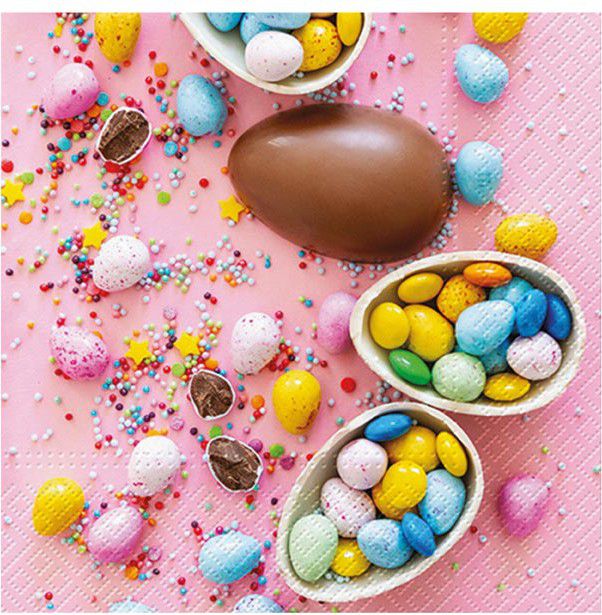 - Rozmanité barvy a drobné detaily velikonočních vajíček, sladkostí a dekorací vytvářejí hravý a veselý motiv, který k velikonočnímu ubrousku patří.