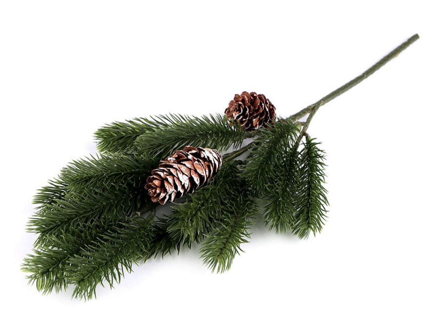Dekorační větvičku smrku doplňují přírodní šišky. [Jednotlivé větvičky jsou ke stonku připevněné drátkem.] Smrk vynikne ve vázách, truhlících nebo na sváteční vánoční tabuli.