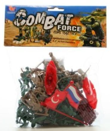 Plastoví vojáčci v sáčku, obsahuje také vlajky a zátarasy.