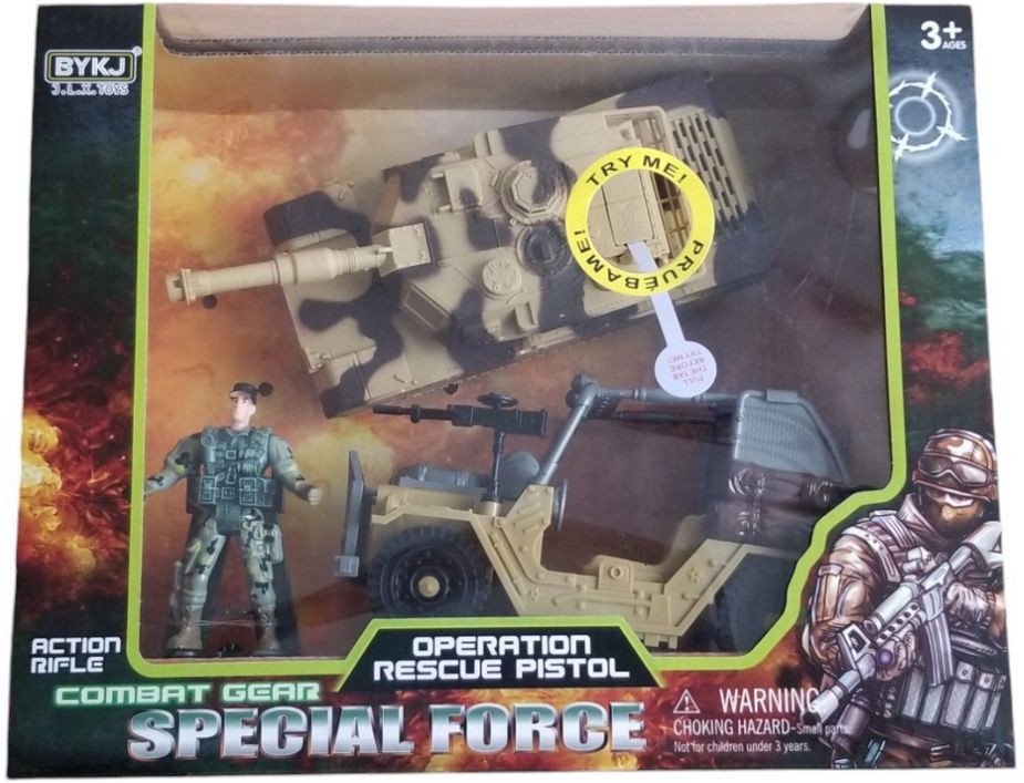 - Plastová vojenská sada obsahuje terénní auto, tank (jezdí a vydává zvuky - napájení na 3 AG13 baterie, které jsou součástí balení) a vojáčka.
