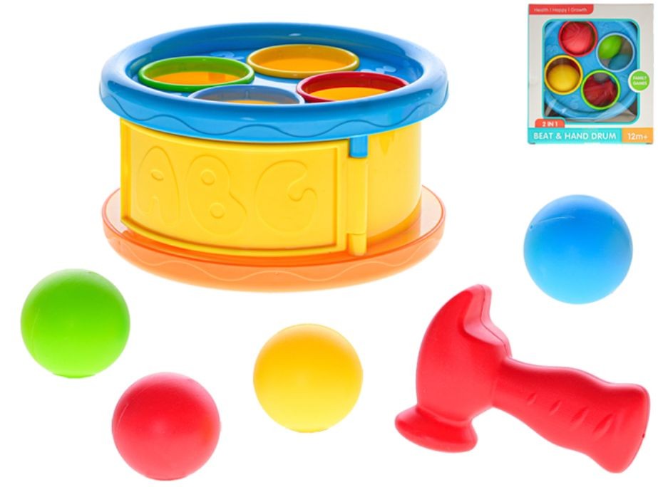- Z jedné strany zatloukačka s kladívkem pro děti a ze strany druhé bubínek.