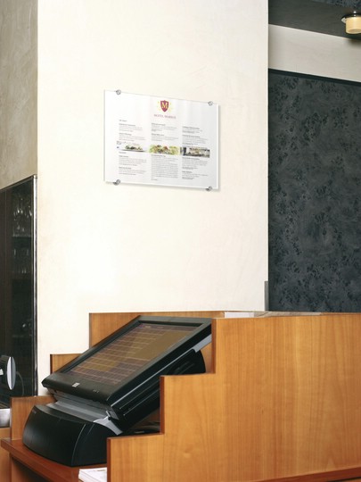 Nástěnná tabulka z kvalitního průzračného akrylu. Fólie se vkládá mezi dvě akrylové desky a snadno se upevní na zeď pomocí dvou šroubových spojů. Snadná montáž. Jednoduchá výměna textu. Sada obsahuje kompletní infotabuli včetně dvou folií, které lze potisknout v laserové tiskárně.