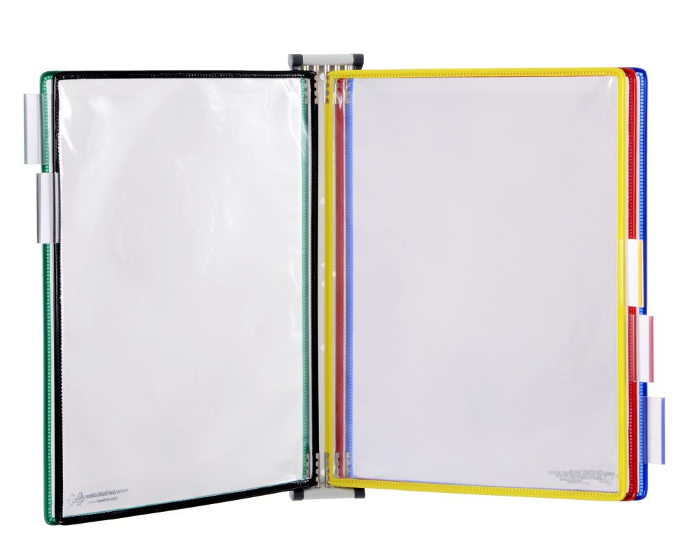 Kovový nástěnný držák včetně 5 kapes A4 s orientací na výšku a otvíráním shora. Pomocí šroubů (součást dodávky) lze držák snadno připevnit na zeď. Používá se všude tam, kde je třeba zviditelnit více dokumentů na malém prostoru, například nástěnka, stroj, stěna apod., nově konstruované zarážky zaručují otevření kapes na zvolené straně. Vhodný pro umístění do průmyslových provozů, skladů či obchodů. Kapsy s úchyty jsou vyrobeny z antireflexního PVC pro optimální průhlednost, povrch kapes se neleskne. Barevný rámeček je zpevněn ocelovým drátem, který zajišťuje stálý tvar a pružnost lemu. Konstrukce kapsy je doplněna o kovové úchyty, které umožňují jednoduché upevnění do držáku. Je možné kombinovat s kloubovým ramenem, pivorackem, či stolním sloupkem s upínacím svěrákem nebo podstavcem