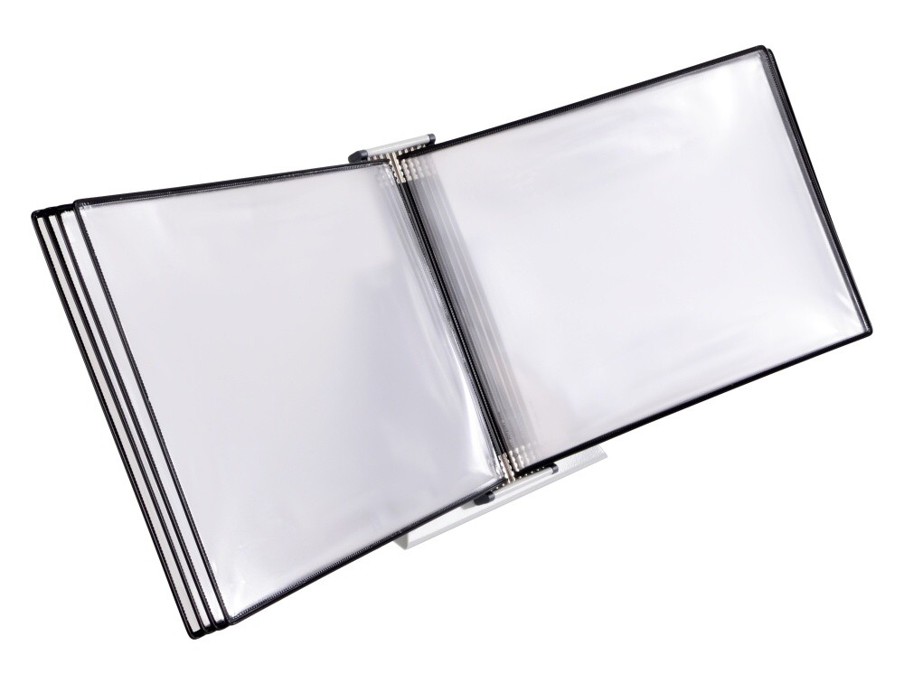 Pultový kovový stojan pro uchycení 10 kapes s úchyty A4 na výšku nebo A3 na šířku. Protiskuzový podstavec dává stojanu velkou stabilitu. Je vhodný na každý kancelářský stůl, pracovní plochu, pult recepce - informace jsou vždy a rychle přístupné. Součástí stojanu jsou 4 aretační zarážky, které zajišťují správné držení kapes. Kapsy s úchyty nejsou součástí dodávky a je nutné dokoupit samostatně. Barva: světle šedá RAL 7035